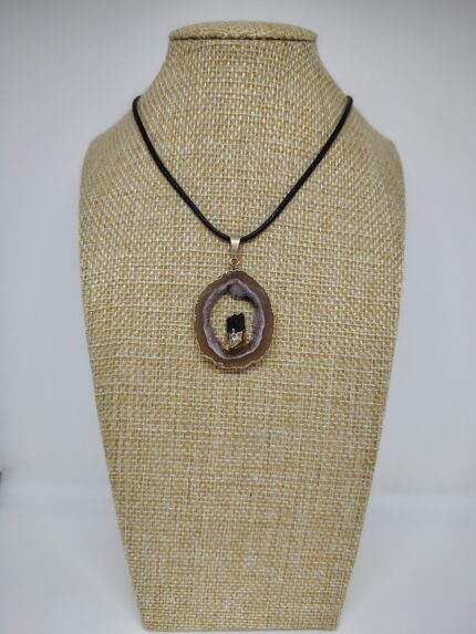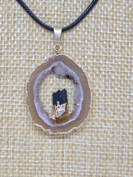 Este colgante esta formado por una placa circular de shungita y una chapa circular de acero plateado.