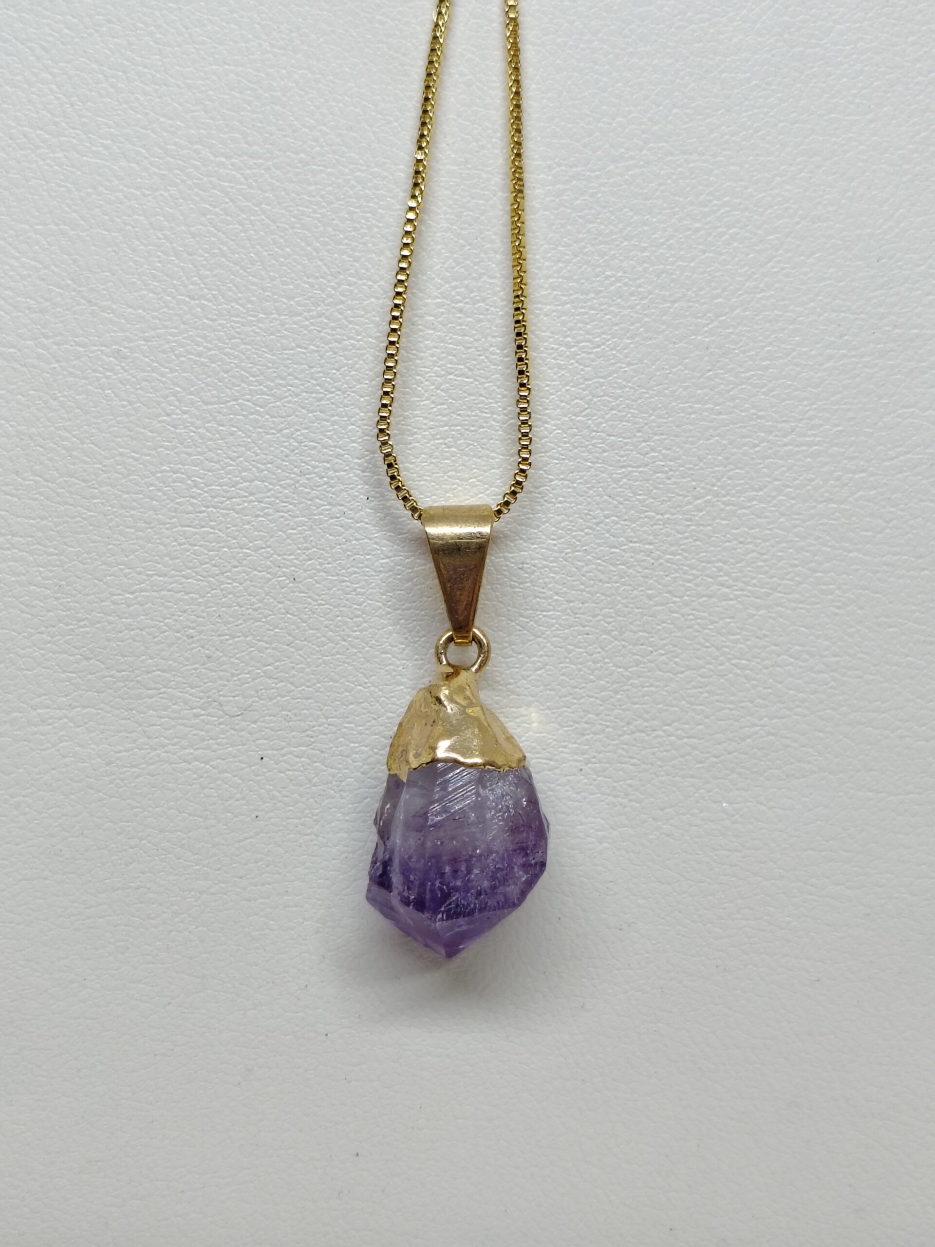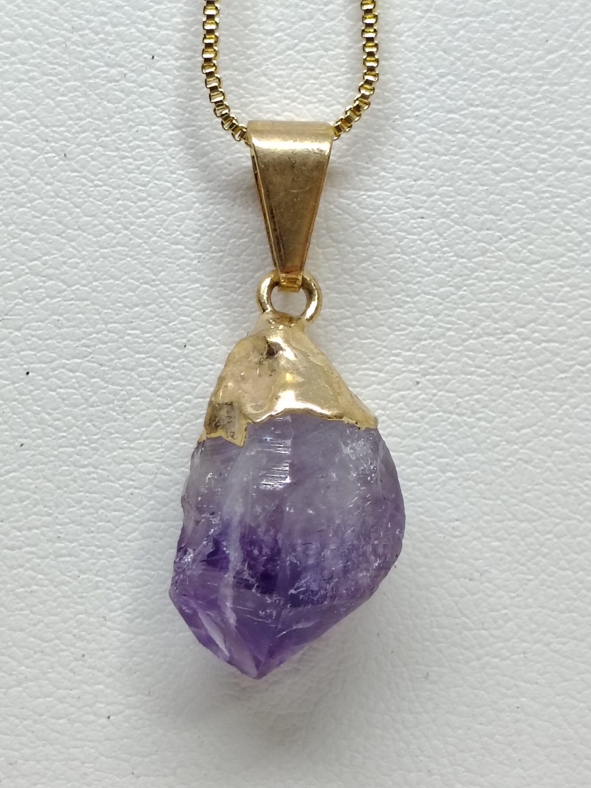 El dije consiste en una piedra amatista en bruto, lo que significa que la piedra no ha sido pulida ni tallada, conservando su forma y textura natural. La amatista es una variedad de cuarzo de color violeta, conocida por su belleza y propiedades curativas. La piedra de amatista se encuentra en su estado original, lo que le da un aspecto orgánico y auténtico. Su color violeta puede variar en tonalidades, lo que hace que cada dije sea único y especial. El dije está montado en un portadije de electroplata dorado.